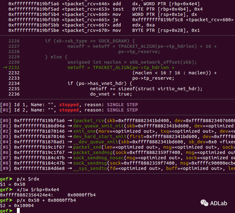 rdxÖдæ·Å×ÅTPACKET_ALIGN(tp_hdrlen+(maclen < 16 ? 16 : maclen))£¬¾ÞϸΪ0x50¡£rbp+0x4e4´¦´æ·Å×Åpo->tp_reserve£¬¾ÞϸΪ0x0000ffb4¡£Ïà¼Óºó£¬ÕûÊýÉÏÒçºó£¬rdxΪ0x0004¡£µ±Ö´Ðе½Ô½½ç»á¼ûʱ£¬ÏêϸÈçÏ£º